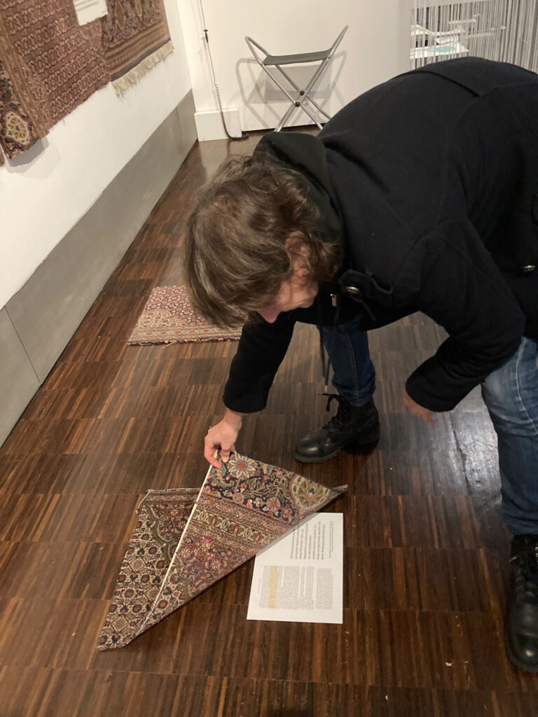 Zurück auf Anfang. Wir werden von einer Besucherin darauf hingewiesen, doch mal unter die Perserteppiche zu schauen – hier werde etwas unter den Teppich gekehrt. Und tatsächlich: Unter den Teppichflicken, die aus den Perserteppichen herausgeschnitten wurden, liegen Dokumente und Fotos. Eines interessanter (und verstörender) als das andere. Hier ein Hinweis auf Kinderarbeit, dort ein Dokument aus dem Jahr 1946, das auf die Arbeitsbedingungen der Arbeiter:innen im iranischen Kerman und auf Probleme wie unzureichende Sitzgelegenheiten hinweist.